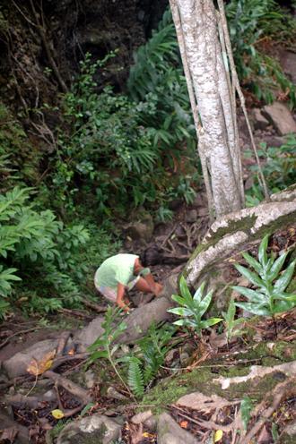 Najpierw sciezka, a jak sie juz skonczy, po lianach na dol, obok piewszy spadek wodospadu, chce dotrzec do nizszych partii. Wole nie myslec, jak to bedzie z powrotem, na towing nie mozna liczyc:)